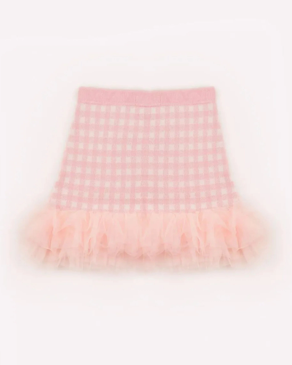 Delicadeza com um toque fashionista. A saia short de tricot xadrez da coleção Pituchinhus Barbie encanta com o cós elástico para ajuste confortável e a silhueta da Barbie aplicada com cristais na parte frontal, trazendo brilho e charme na medida certa. O detalhe de frufru de tule na barra adiciona leveza e romantismo à peça, perfeita para composições elegantes e cheias de personalidade.